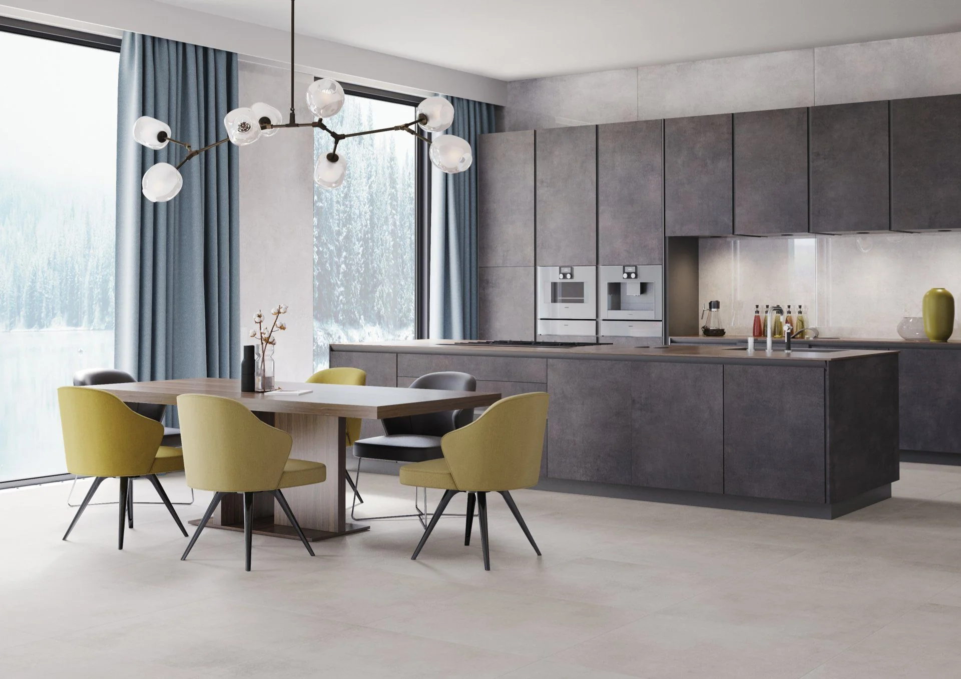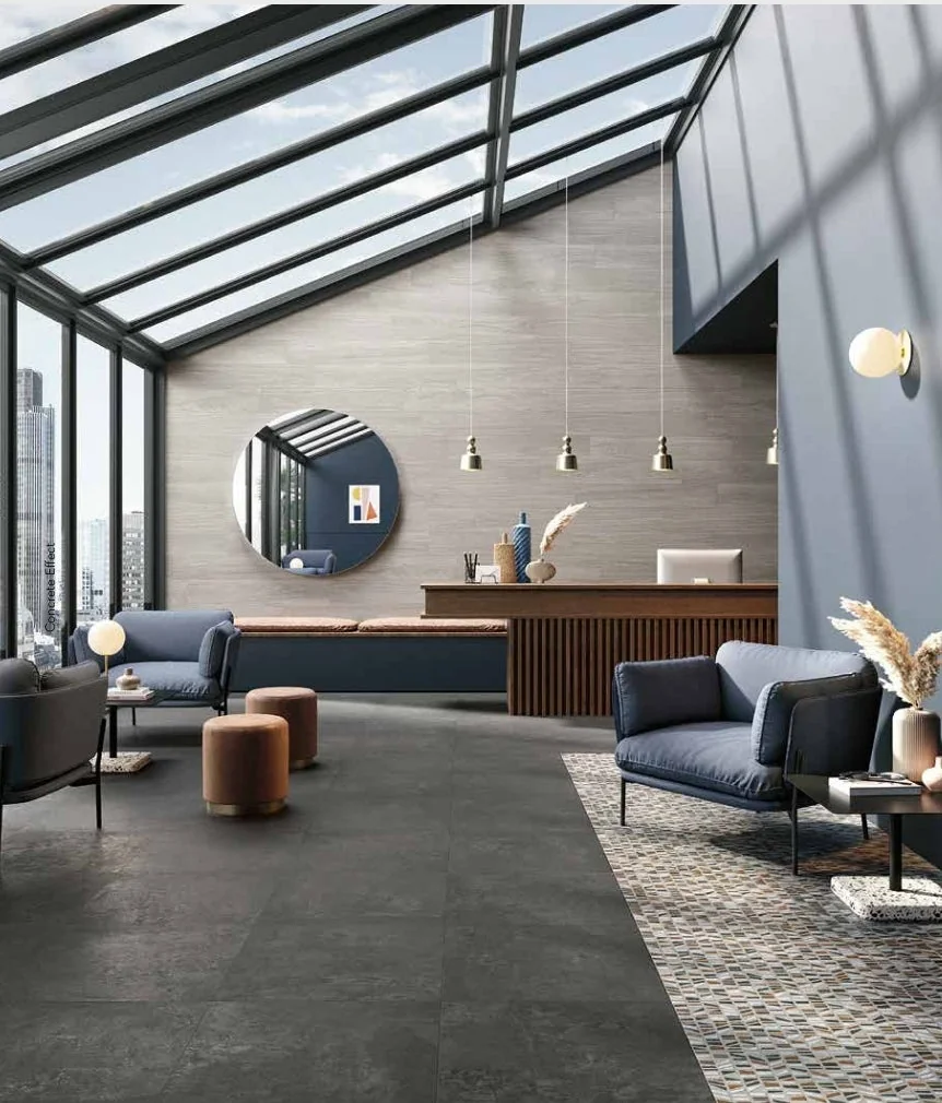 On floors, concrete floor tile or concrete look floor tiles can run from living areas into dining zones for a seamless effect. Large concrete tiles reduce grout lines and make spaces feel more expansive. In compact rooms, using concrete porcelain tiles in a simple grid keeps surfaces calm and easy to clean.