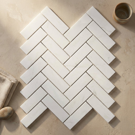 View full detailsThassos White (Greek) Thassos White Marble 1 x 3 Polished Herringbone Mosaic features a Polished surface and marble appeal suited to living areas. ...