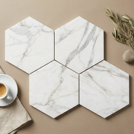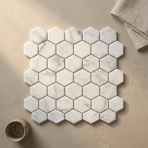 View full detailsCalacatta Gold (Italian) Calacatta Gold Marble 5 x 5 Polished Hexagon Mosaic brings marble depth and a Polished finish to feature walls. Choose it ...