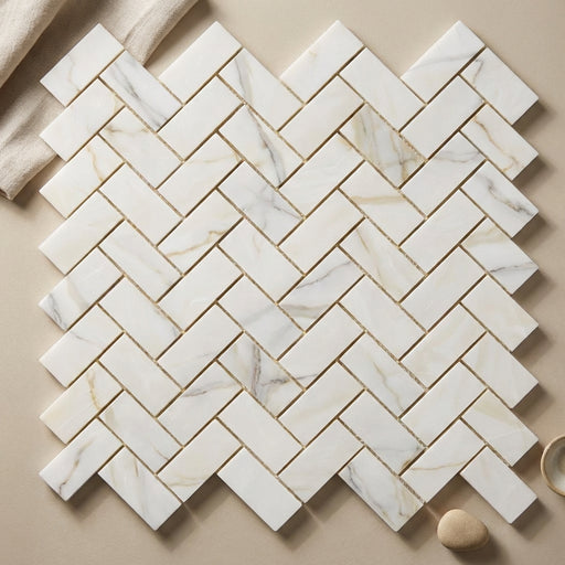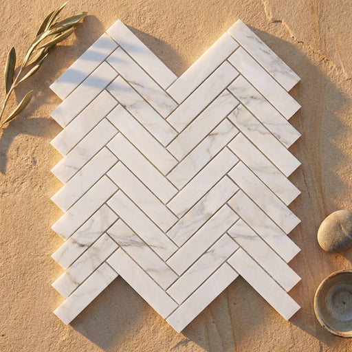 View full detailsCalacatta Gold (Italian) Calacatta Gold Marble 1 x 3 Polished Herringbone Mosaic brings marble depth and a Polished finish to feature walls. Choose...
