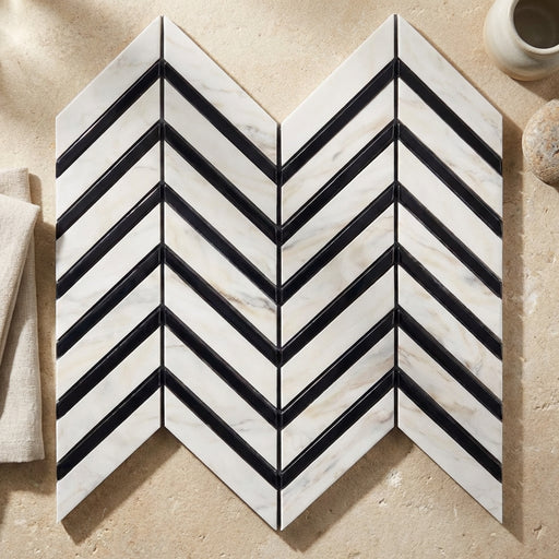 View full detailsCalacatta Gold (Italian) Calacatta Gold Marble Polished Chevron Mosaic Chevron (LARGE) (w/ Blue-Gray) is a Polished marble mosaic designed to bring...