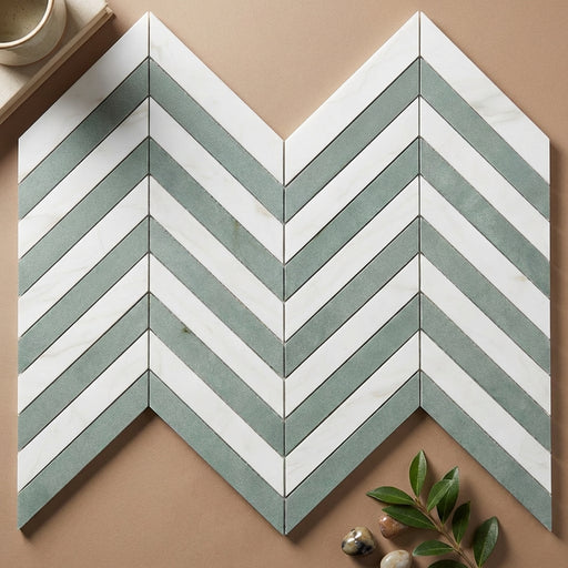View full detailsCalacatta Gold (Italian) Calacatta Gold Marble Polished Chevron Mosaic Chevron (LARGE) (w/ Ming-Green) brings marble depth and a Polished finish to...