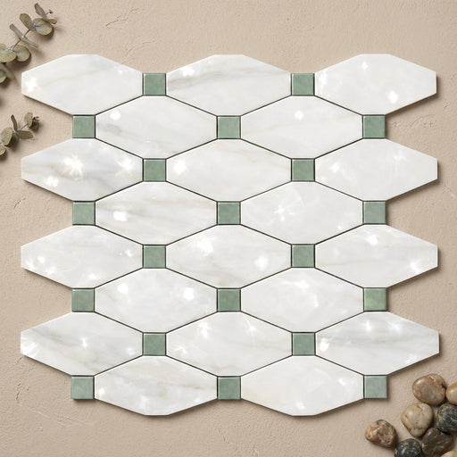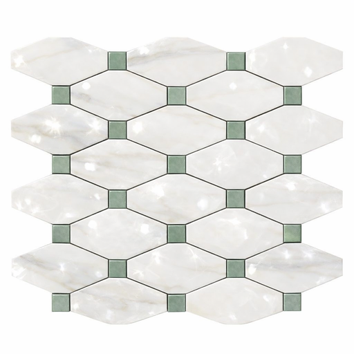 View full detailsCalacatta Gold (Italian) Calacatta Gold Marble Polished Octagon Mosaic Octagon Mosaic (w/ Ming-Green) features a Polished surface and marble appeal...
