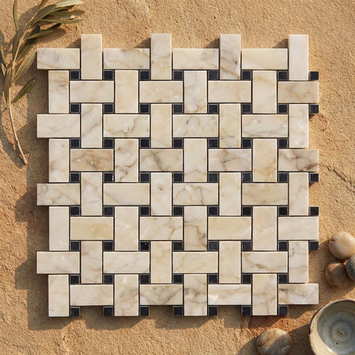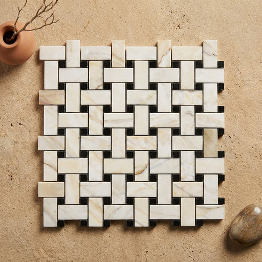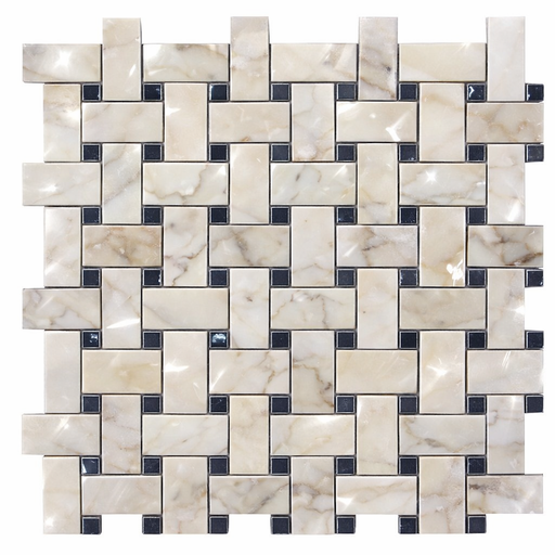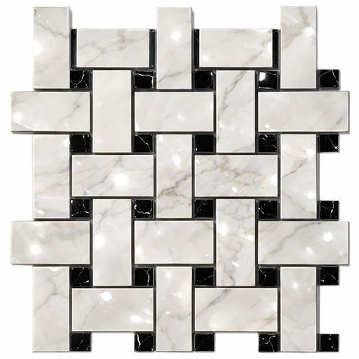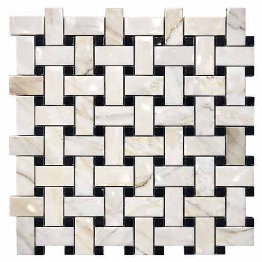 View full detailsCalacatta Gold (Italian) Calacatta Gold Marble Polished Basketweave Mosaic Basketweave Mosaic (w/ Black) is a Polished marble mosaic designed to br...