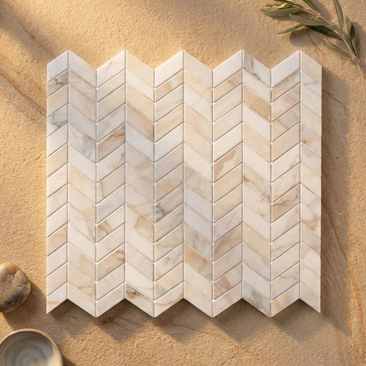 View full detailsCalacatta Gold (Italian) Calacatta Gold Marble Polished Chevron Mosaic Chevron (Mini) features a Polished surface and marble appeal suited to livin...