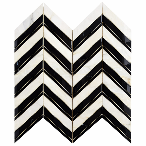Calacatta Gold (Italian) Calacatta Gold Marble Polished Chevron Mosaic Chevron (LARGE) (w/ Black) is a Polished marble mosaic designed to bring a c...