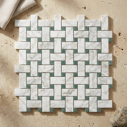 View full detailsCalacatta Gold (Italian) Calacatta Gold Marble Polished Basketweave Mosaic Basketweave Mosaic (w/ Ming-Green) offers Polished marble style in a pol...