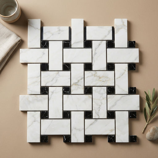 View full detailsCalacatta Gold (Italian) Calacatta Gold Marble Polished Basketweave Mosaic Basketweave Mosaic (w/ Black - (LARGE)) brings marble depth and a Polish...