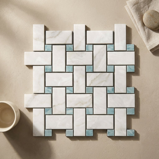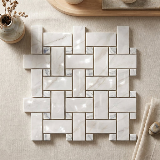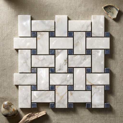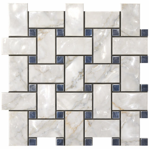 View full detailsCalacatta Gold (Italian) Calacatta Gold Marble Polished Basketweave Mosaic Basketweave Mosaic (w/ Blue-Gray) offers Polished marble style in a poli...
