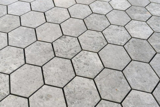 View full detailsTundra Gray Marble 2 x 2 Polished Hexagon Mosaic is a polished marble mosaic designed to bring a clean, refined look to kitchens and baths. Designe...