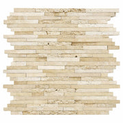 Ivory / Light Ivory Travertine 3/8 x Free Length Cream Polished & Honed & Split-faced (Mix) Random-Strip Mosaic Random-Strip Mosaic - (No Grout) delivers polished & honed & split-faced (mix) travertine character with a timeless profile for walls and floors. Perfect for pairing with other finishes, it helps create a cohesive installation.